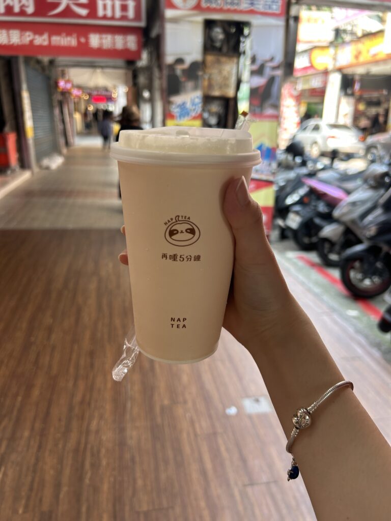 「再睡5分鐘nap tea」というお店の上にホイップの乗った烏龍ミルクティーがおいしかったです!
